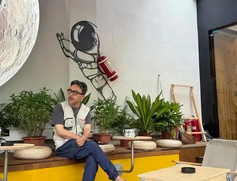 去年5月在长沙咖啡店外,穿短裤配风衣,脚踩人字拖,桌上摆着槟榔袋和大烟斗,跟老板唠得热火朝天;